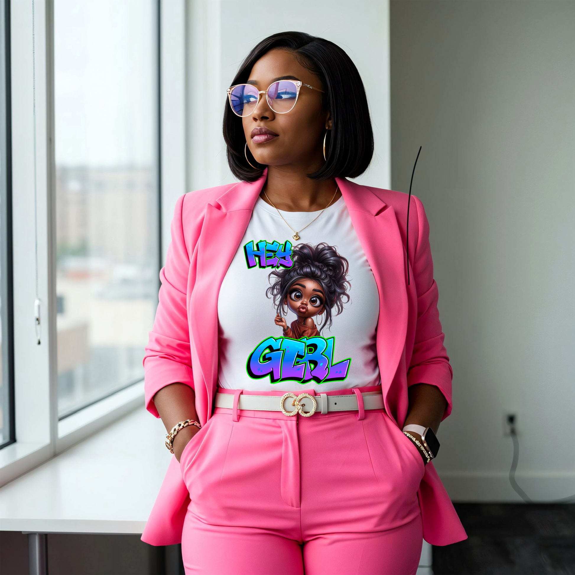 This crisp white cotton tee brings the energy with a vibrant DTF print that pairs the words “Hey Girl” with a cheeky cartoon character front and center. It’s soft, breathable, and built to stand out—whether you’re stepping out or showing off.