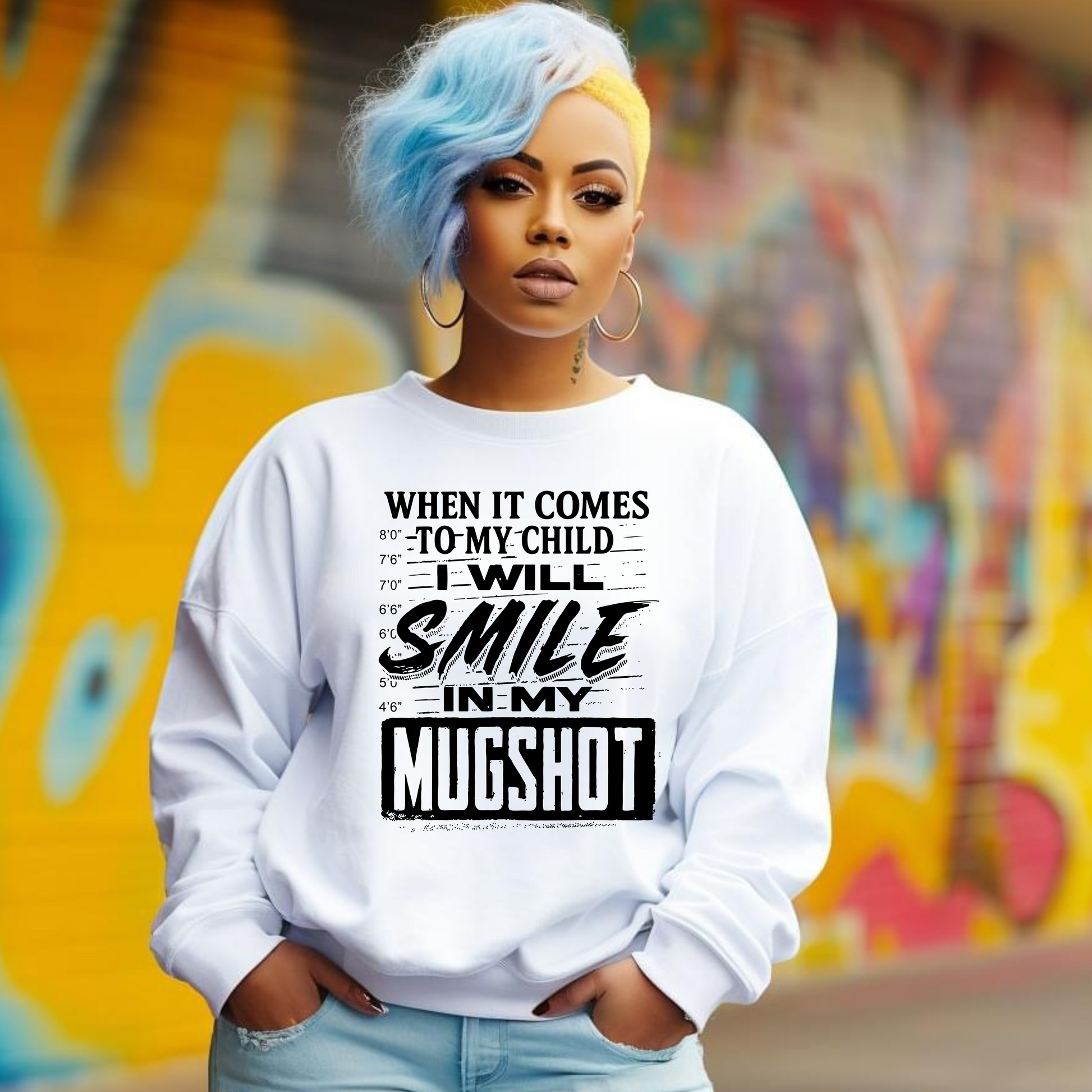 Front reads: “When it comes to my child, I will smile in my mug shot.”