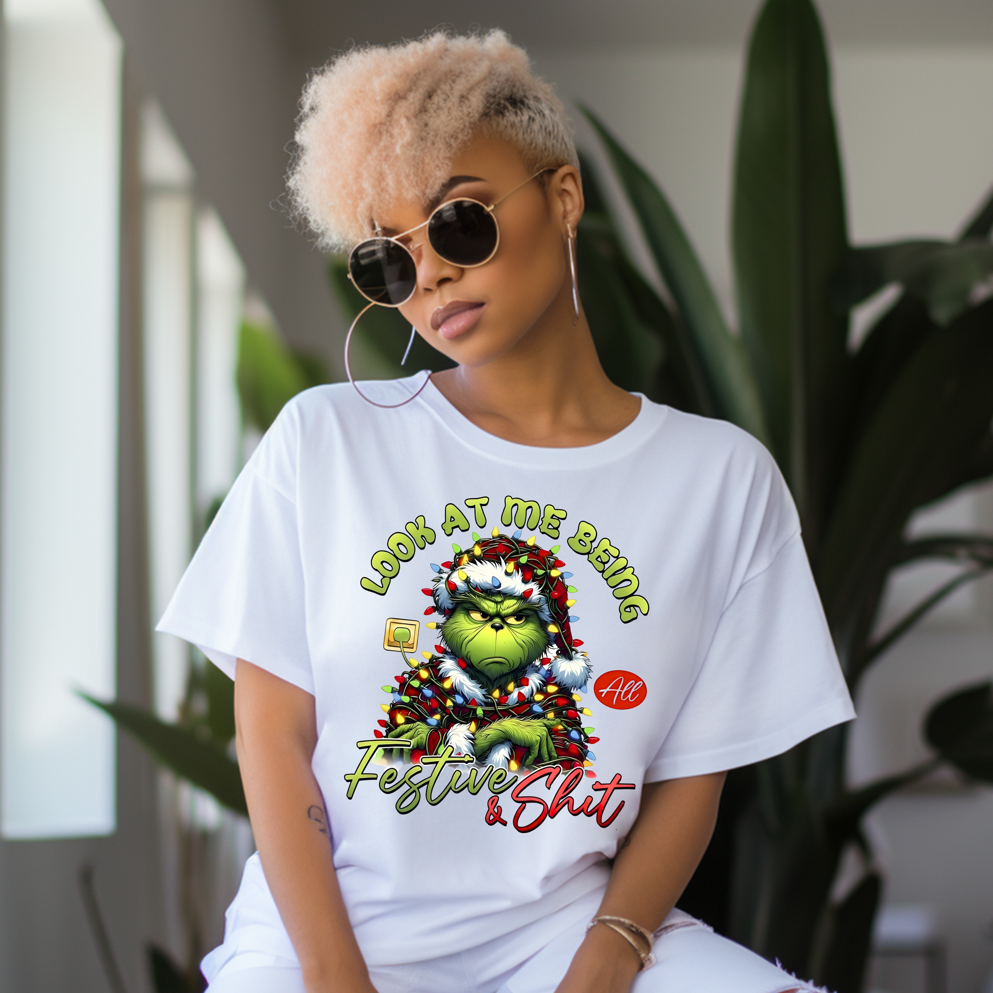 You didn’t ask for holiday cheer, but here it is — printed loud and proud on your chest. This tee features the Grinch in full sass-mode, paired with the phrase “Look at Me Being Festive” like he’s doing the bare minimum and still stealing the spotlight. It’s the perfect shirt for anyone who celebrates with side-eye and sarcasm.